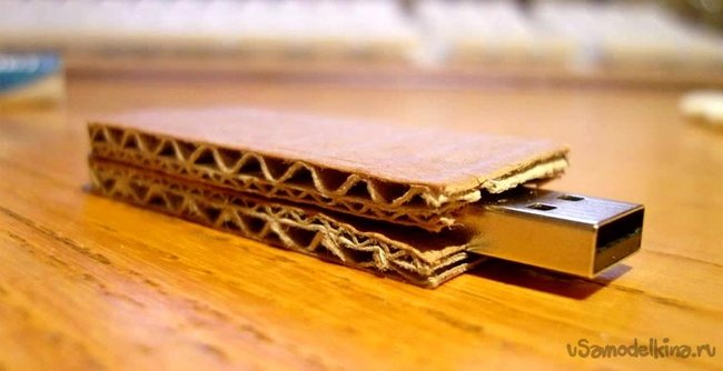 Из двух заготовок плотного картона и одной части флешки у нас должен получиться своеобразный «бутерброд», где заготовка из картона будет находиться сверху и снизу, а флешка посередине.