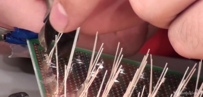 После запаивания первого ряда, чтобы выводы уже припаянных светодиодов не мешали дальнейшей работе можно откусить при помощи кусачек. Скотч убираем.
