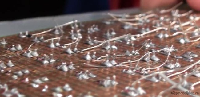 Теперь переворачиваем нашу плату, с обратной стороны которой находятся выводы всех светодиодов и начинаем их друг за другом не спеша припаивать.