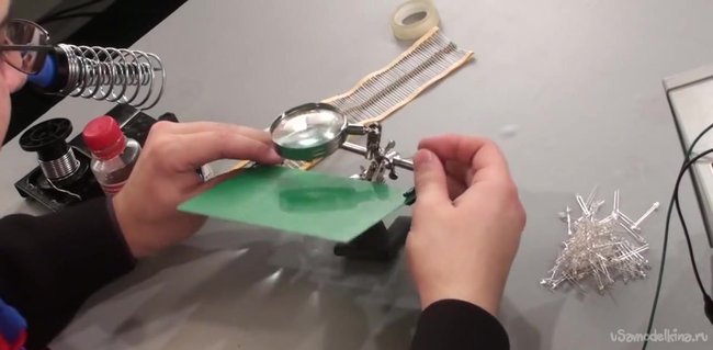 Сначала припаиваем на плату светодиоды. Для удобства закрепляем каждую состоящую из них линию скотчем, чтобы у нас была возможность перевернуть плату и запаять сразу все линию светодиодов.