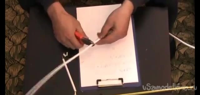 Кусачками откусываем по отмеченной линии. А по отмеченной первой метке делаем канцелярским ножом надрез. Снимаем изоляцию. Также снимаем экран или экранирующую оплетку, отрезаем полностью, он нам не нужен. Лавсановую оплетку также удаляем за ненадобностью.