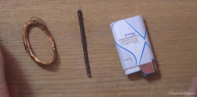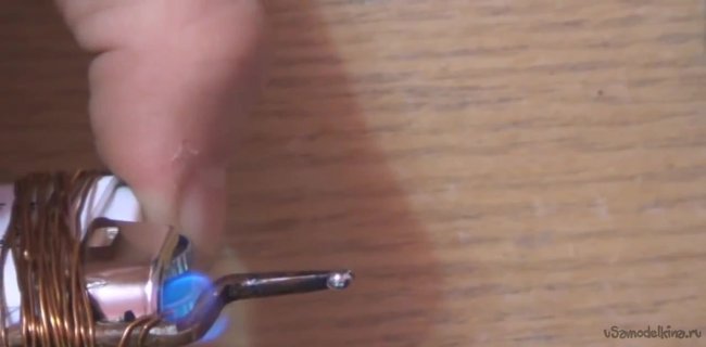 Из боле толстой проволоки мы будем делать жало. Толщина ее не обязательно должна быть 4 мм, можно брать плюс минус. Не забывайте только, что с более толстым жалом будет очень неудобно работать, и оно будет значительно дольше нагреваться.