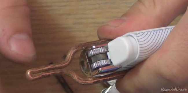 Теперь прикладываем сделанное жало будущего паяльника к самой зажигалке и при помощи тонкой проволоки или хомута крепим его. Крепление делаем путем обматывания проволоки вокруг корпуса зажигалки, чем больше витков вы сделаете, тем надежнее будет зафиксировано жало импровизированного паяльника и тем удобнее потом вам будет работать.