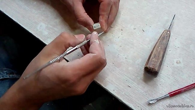 Второй вариант штампика можно сделать из глины. Принцип лепки такой же как и с гипсом. Из глины лепим прямоугольник. Форма будущего штампика должна напоминать школьную ластик, так ее удобней будет держать в руках.