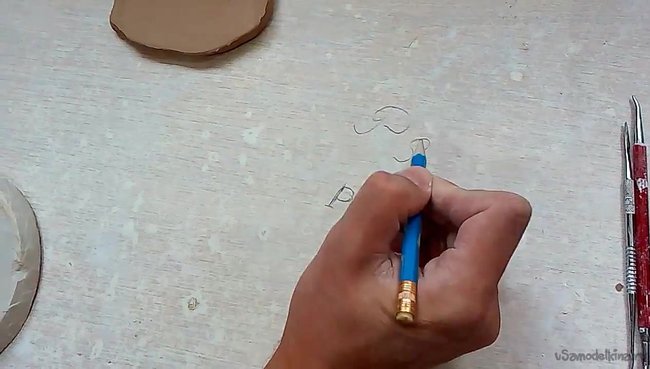 Опять берем иголку и по границе рисунка на глине выдавливаем наши символы.
