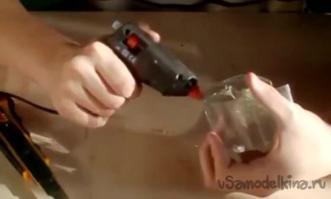 Для лучшего и более глубокого эффекта нам также нужно заполнить наш коробок клеем от клеевого пистолета. В конце можно обклеить куб кусками металлической банки, а можно и оставить таким, какой он есть. Тут уже дело вкуса и собственных предпочтений.