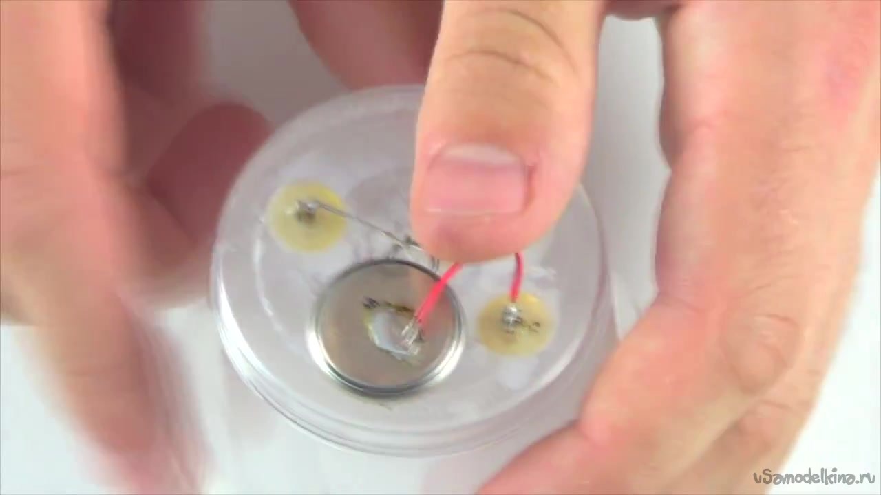 Ко второй кнопке припаиваем минус от светодиода. Тем самым у нас получается разрыв, который не позволяет светодиоду загораться, а разрыв будет замыкать вода или другой напиток.