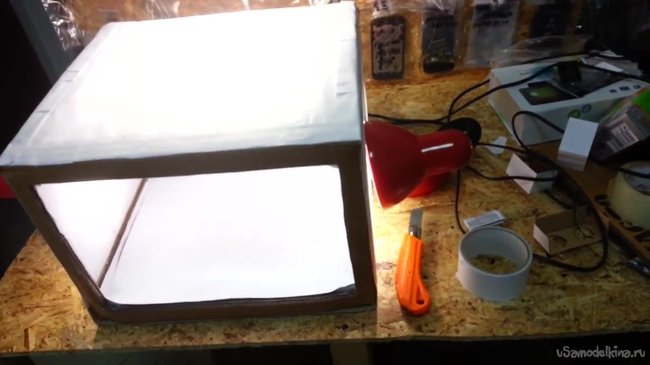 С трех сторон к коробке устанавливаем настольные лампы, чтобы получился яркий свет.