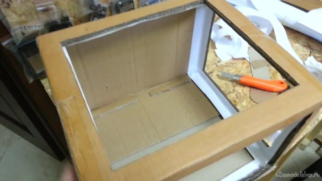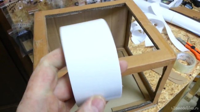 Всю внутреннюю сторону обклеиваем белыми полосами. Все, что у нас коричневое от коробки – должно стать белым.