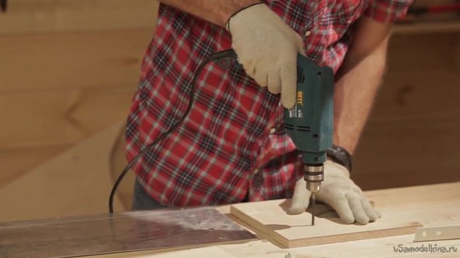 При помощи саморезов мы скрепляем боковую часть полки с верхней частью полки.