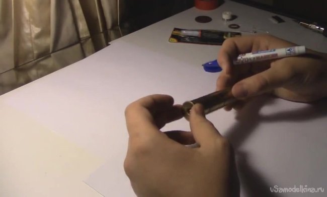 Теперь мы можем начать собирать наше устройство. Гильзу метками разделяем на 3 части. Потом по этим меткам мы ее должны будем разрезать, чтобы получить несколько ровных частей.