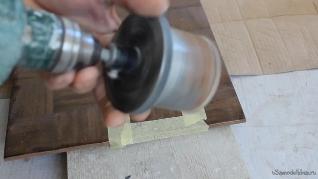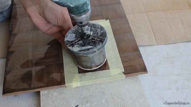 На плитке отмечаем место, где будет отверстие под розетки, оклеиваем его бумажным скотчем и начинаем просверливать круглые отверстия под розетки. Во время сверления место разреза поливаем водой, чтобы остудить. Проверяем, как входят в отверстия подрозетники.