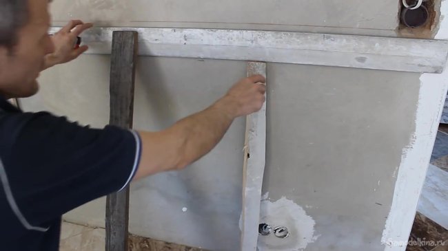 В самом начале работ необходимо при помощи уровня и сантиметра отмерить от напольного покрытия 85 см, высоту кухни. Обязательно отметьте на стене линию, которая будет ограничивать нижний край плитки. К прочерченной линии прикладываем обрезок доски, который подпирается ненужными кусочками, деревяшками, регулируется по нужному уровню, чтобы четко видеть, где должна заканчиваться плитка.