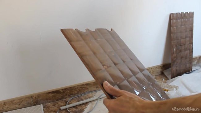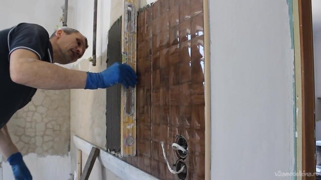 Теперь разводим клей, как в инструкции. Шпателем наносим клей на саму стенку, а также на плитку, не слишком толстым слоем. Прикладываем плитку на место, начиная от входа, уровнем измеряем ровность ее установки и прижимаем.