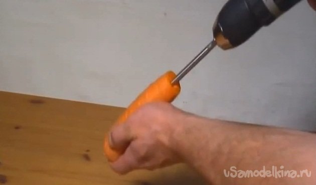 С помощью сверла сделайте в моркови продольное отверстие. Сверло можно вращать руками, но лучше использовать дрель – стенки отверстия получаться более ровными.