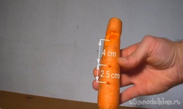 Итак, дудочка из моркови готова. Чтобы играть на ней, приложите её к губам и подуйте. Дудка издаст пищащий звук.