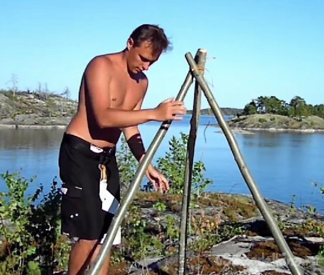 Сначала нужно связать три шеста, предварительно подготовив не слишком глубокие надпилы для того, чтобы веревки лучше держались. Связывать шесты следует не слишком сильно, так, чтобы можно было установить эту конструкцию на землю как треножник.
