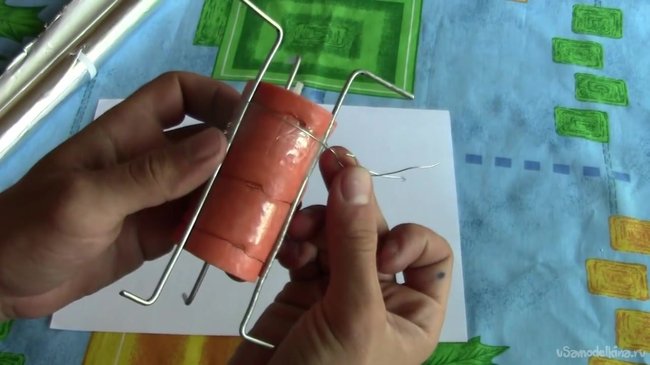 Сверху свечу аккуратно обматываем фольгой и снова фиксируем тонкой проволокой.