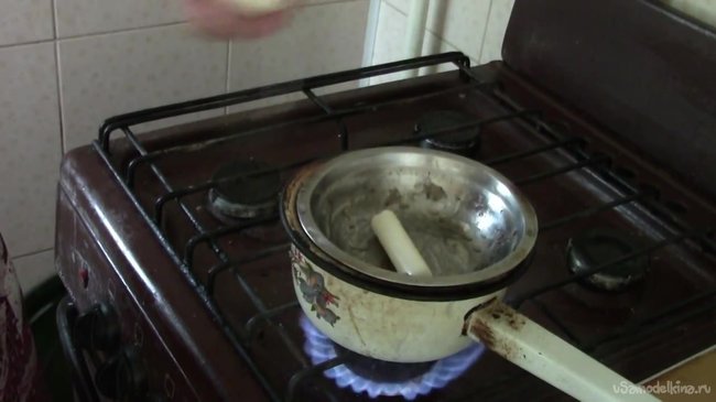 Растапливаем парафиновые свечи на водяной бане, предварительно вынув из них фитиль.