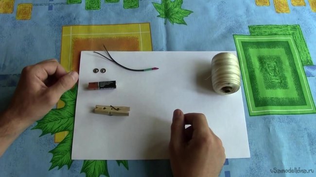 Наматываем один конец провода на кончик канцелярской кнопки и забиваем ее во вторую половинку прищепки.