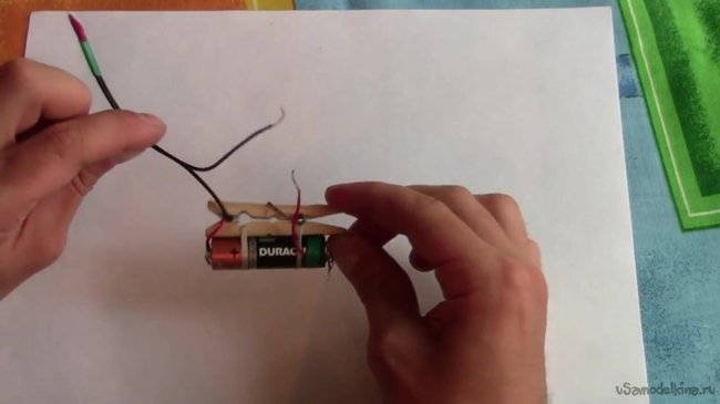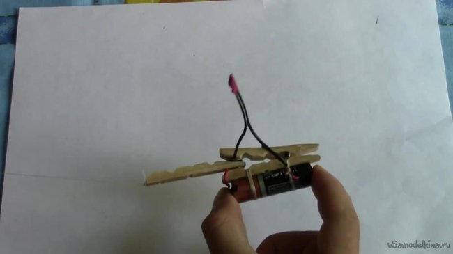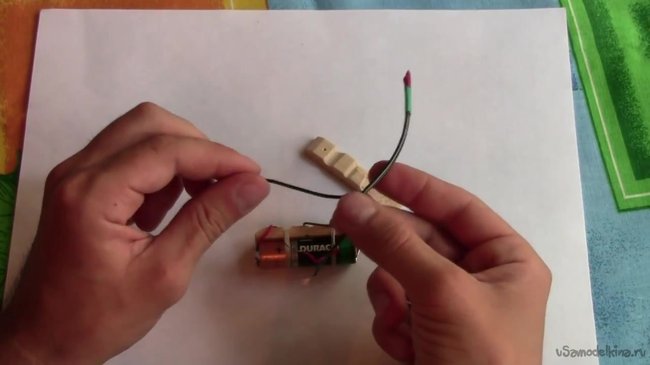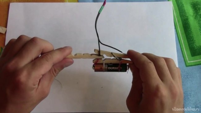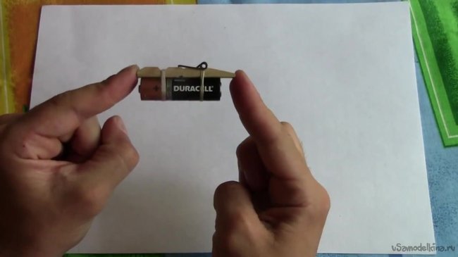 К той половинке, которая осталась с пружинкой, к ровной стороне крепим пальчиковую батарейку. Прикрепить нужно так, чтобы плюс батарейки находился на носике деревяшки.