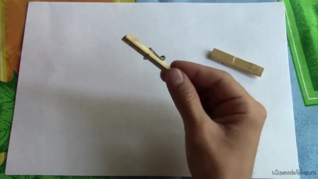 Также нам понадобиться еще одна половинка прищепки без пружинки. Проделываем в ее хвостике небольшое отверстие шилом и продеваем нейлоновую нить.