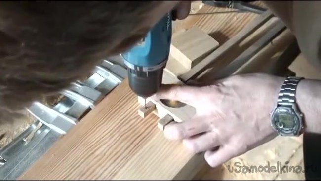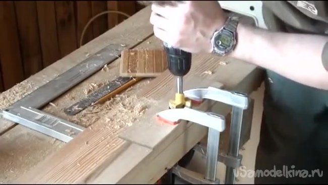 Далее берем сверло Фермера и высверливаем круглое отверстие в накладке по точке, которую мы делали ранее сверлом. Нужно сверлить не только накладку, но и бобышку на глубину 1 мм.