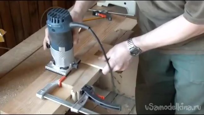 Теперь нужно сделать фрезерование паза. Берем планку толщиной 200 мм и накладываем на нее упор с шаблоном.