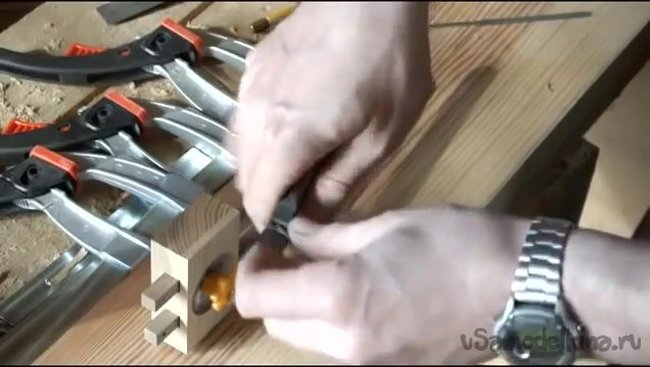 Приступаем к склейке. Бобышку намазываем клеем и накладываем на нее накладку. Прижимаем накладку к бобышке и ждем, когда вся конструкция высохнет.