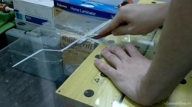 В качестве фанеры автор видео использует органическое стекло. Берем оргстекло и отрезает необходимый нам по размере кусок при помощи ножовки.