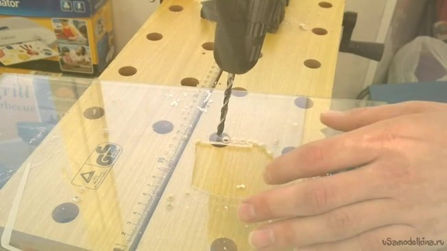 Следующим делом нам необходимо позаботиться об отверстиях, через которые будет проходить воздух. При использовании обычной дрели можно придумать своеобразную сеточку и просверлить несколько отверстий обычным сверлом маленького диаметра. При сверлении сверлом большого диаметра оргстекло будет трескаться.