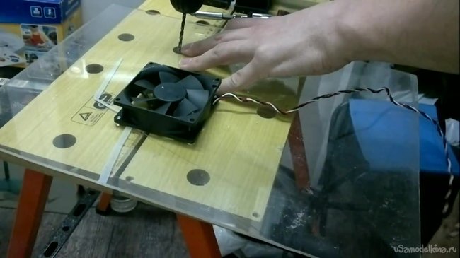 Ставим наши кулеры на оргстекло и метим места отверстий для креплений. Сверлим при помощи дрели.