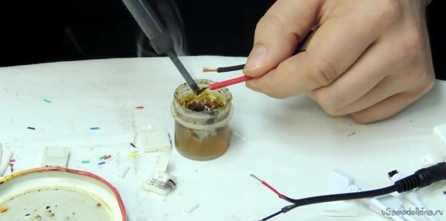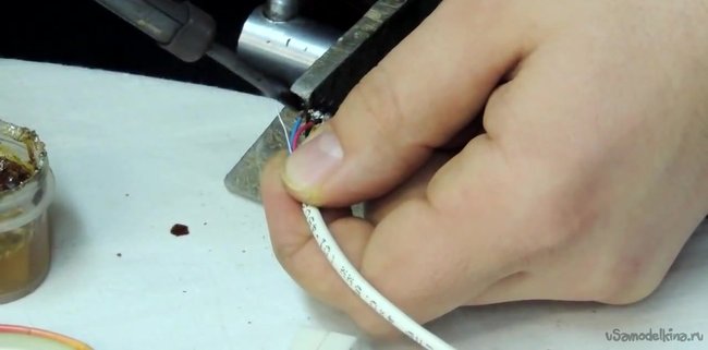 Наобе стороны провода нужно припаять разъемы кконтактам. Дляэтого зачищаем провод.