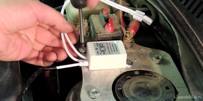 Установку нежно начать сблока управления. Автор устанавливает его напланку рядом срубильником усилителя откоторого ибудет взят плюс. Если усилителя нет, томожно взять минус иплюс непосредственно саккумулятора.