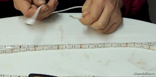 Длятого, чтобы припаять контакты ксветодиодной ленте, необходимо снять ее верхний слой, освободив таким образом контакты наленте.