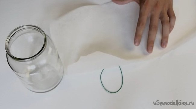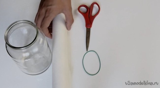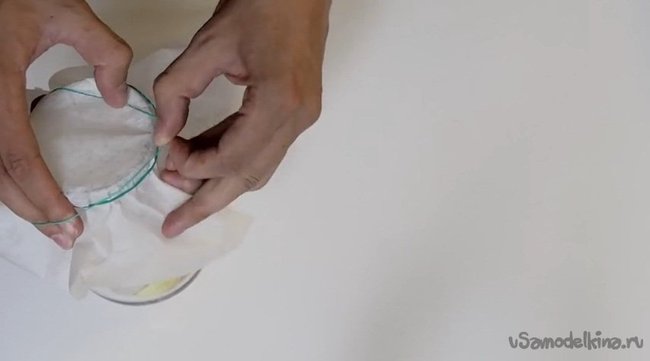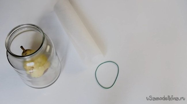 На горлышко банки положите лист пергамента и обмотайте его резинкой, чтобы он плотно держался. Постарайтесь, чтобы поверхность пергамента была натянута.