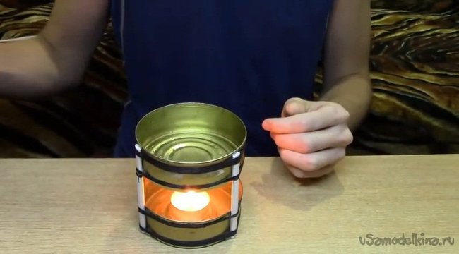 Зажгите свечу и поставьте её в нижнюю консервную банку.