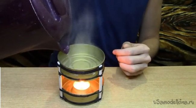 Верхнюю банку наполните до половины водой. Чтобы не ждать, пока вода нагреется от пламени свечи, можно использовать кипяток.