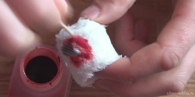 Теперь можно приступить к самому интересному – нанесению искусственной крови на бинт. Для этого берем краску и ватной палочкой наносим на углы соединения гвоздя с бинтом.