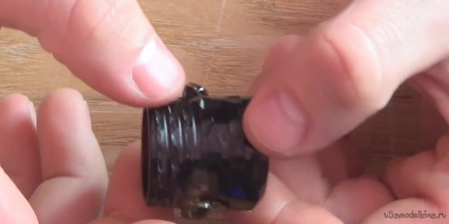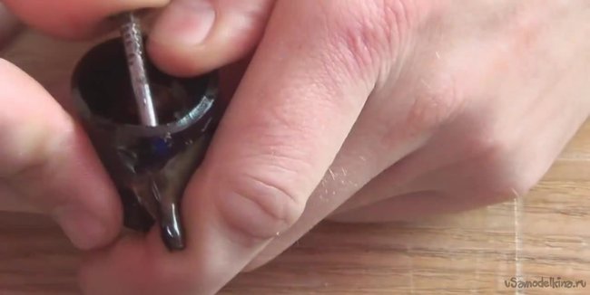 Далее проделываем на горлышке два отверстия под диаметр гвоздя.