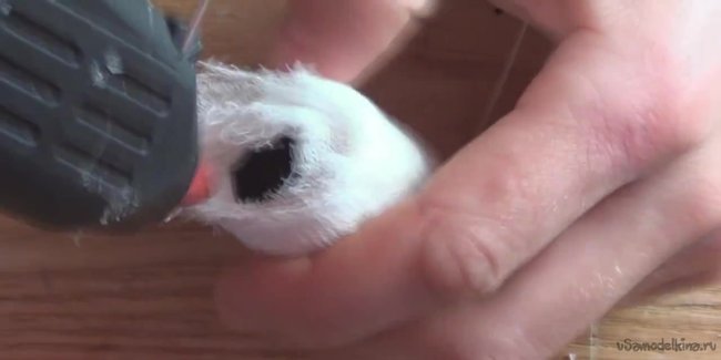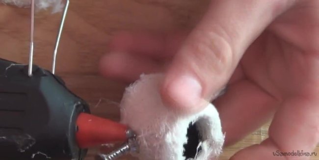 Наносим термоклей на две половины гвоздя и клеем их на своих местах. Бинт закроет собой места отверстий на пробке, а также места приклеивания.