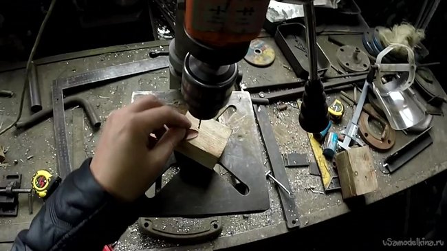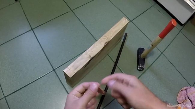 После этого нужно придать заготовкам слегка округленную форму. Для этого берем трубу небольшого диаметра. Затем ставим заготовку на брусок, а трубу на заготовку и бьем по трубе молотком.