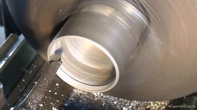 Вначале точим поршень на токарном станке. Протачиваем поршень изнутри, освобождая таким образом проход для стакана. Для того, чтобы подстаканник был стабильным и его можно было класть на ровную поверхность, нам также предстоит слегка отшлифовать нижнюю часть поршня.