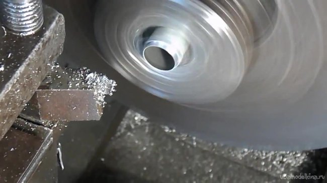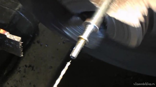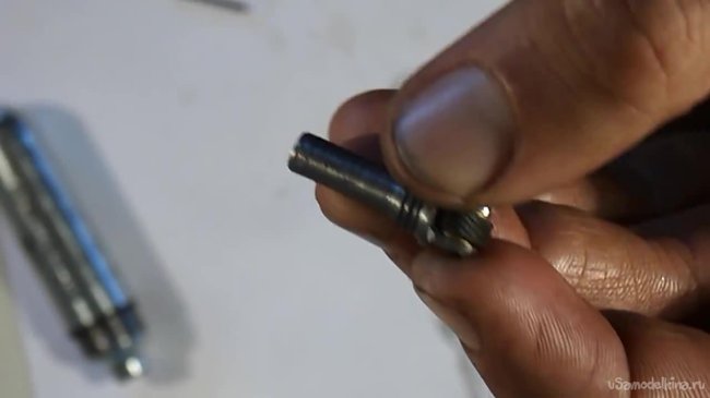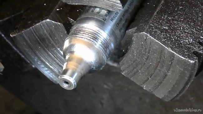 Берем заготовку под диаметр горлышка баллончика. На эту заготовку будет крепиться колесико и кремень. Для того, чтобы наша зажигалка не была одноразовой, и мы имели возможность заменять старый кремень на новый, автор советует также сделать резьбу на заготовке, а также проделать на ней сквозное отверстие для кремня.