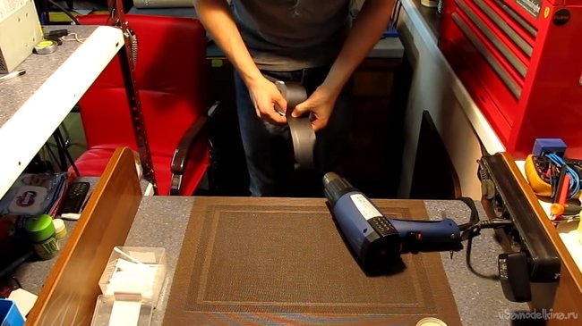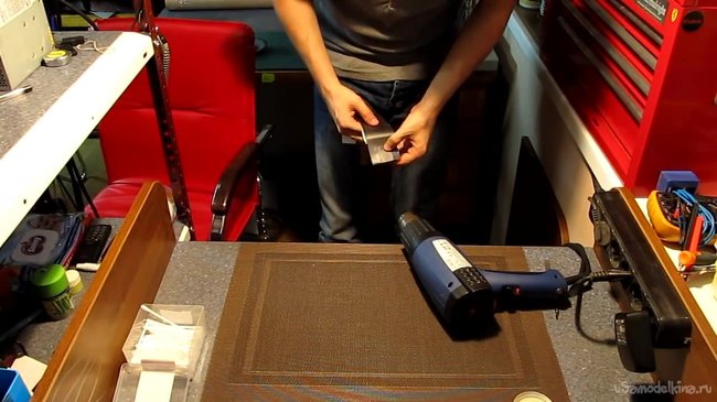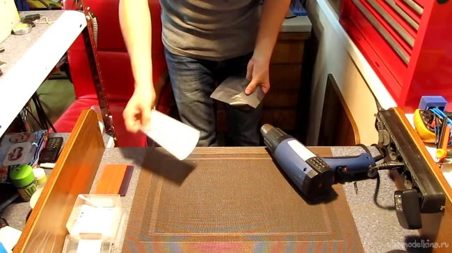 Включаем строительный фен и крайне внимательно выравняем пленку, чтобы она легла максимально ровно. Строительный фен нужен для того, чтобы избежать пузырьков под пленкой. Добавим, что пленку нужно отрезать с запасом по краям.