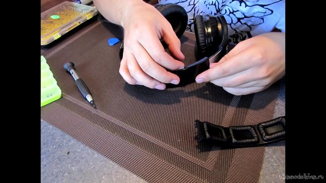 Вначале нам необходимо разобрать наши наушники. Так как клеить пленку для изменения внешнего вида мы будем на пластиковые детали нушников, то при разборке нужно максимально освободить их от остальных деталей и частей. Местами может понадобится помощь отвертки.