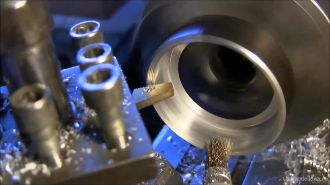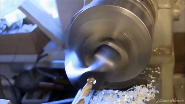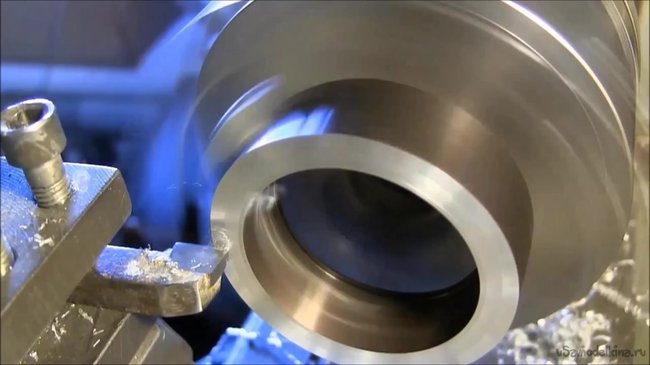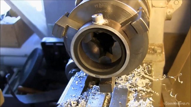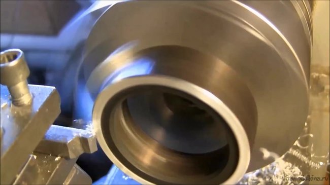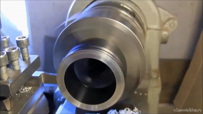 Теперь надеваем заготовку на токарный станок, поскольку нам нужно от торцевать одну сторону нашего корпуса объектива.