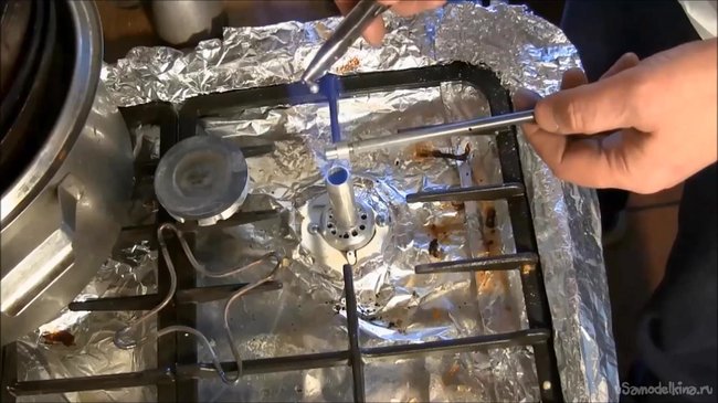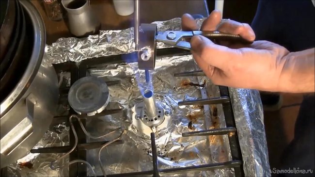 Теперь вставляем наш переходник в отверстие на корпусе объектива и припаиваем. Для этого берем припой для пайки алюминия, включаем газовую горелку, разогреваем переходник и постепенно покрываем припоем.