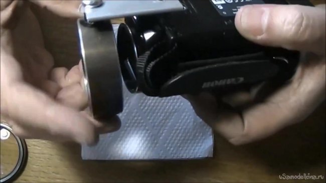 Один винт прикручивается на объективе, а другой на месте крепления штатива на камере.