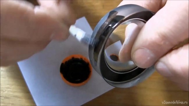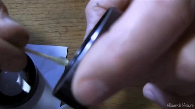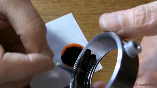 Чтобы избежать бликов при съемке нашим объективом, мы должны покрасить его изнутри в черный цвет. Берем нитрокрсаку и красим ей оправу и линзу.